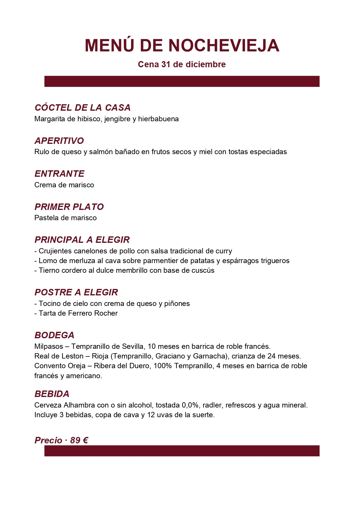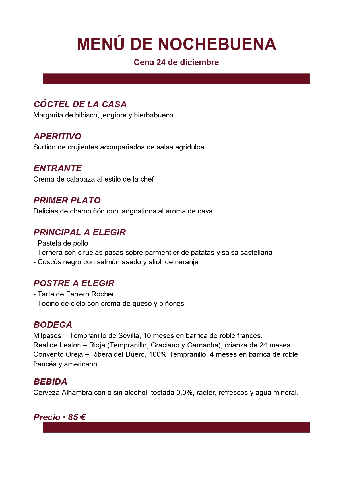 Menús de Navidad y Nochevieja Historia y tradición en tu plato Menú 1 ENTRANTES PARA COMPARTIR Lorem ipsum dolor Lorem ipsum dolor Lorem ipsum dolor SEGUNDOS PARA COMPARTIR Lorem ipsum dolor Lorem ipsum dolor 23,50 € / Comensal Menú 2 ENTRANTES PARA COMPARTIR Lorem ipsum dolor Lorem ipsum dolor Lorem ipsum dolor SEGUNDOS PARA COMPARTIR Lorem ipsum dolor Lorem ipsum dolor 28,50 € / Comensal